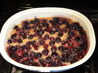 Mix, pour in greased baking dish. Scatter over top your fruit (she used blackberries but I had blueberries in the house so I went with that, as it was an emergency and I had to get this in the oven immediately.)